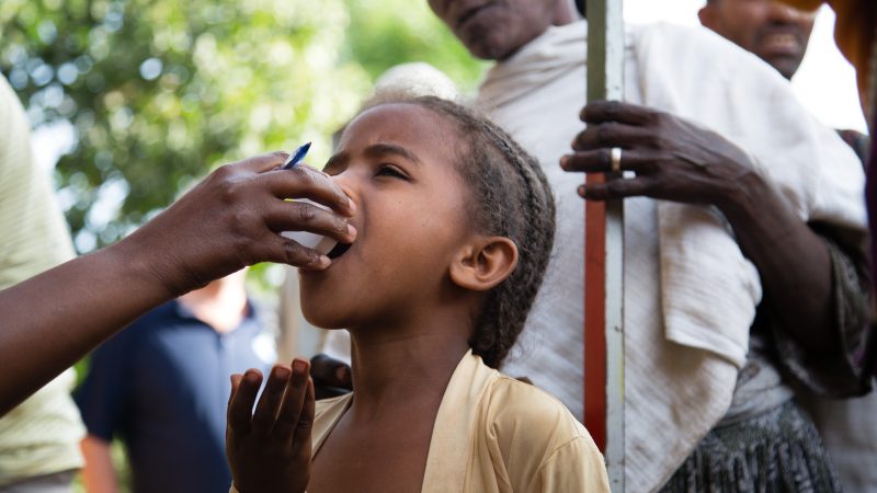 In November 2013, a child in Ethiopia receives the 100 millionth treatment of azithromycin, a trachoma-fighting antibiotic. (Pfizer/William Vazquez)