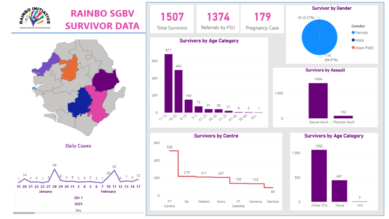 The Rainbo Sexual and Gender-Based Violence Survivor Data Dashboard provides real-time case information drawn from service providers and law enforcement in seven districts across Sierra Leone.