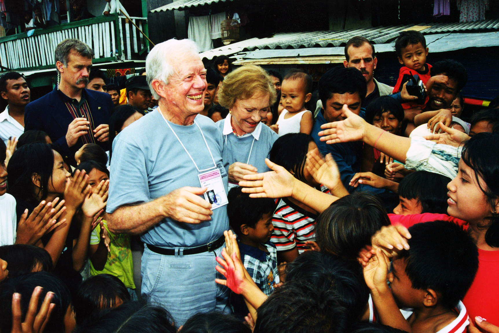 Former U.S. President Jimmy Carter and former First Lady Rosalynn Carter shaking hands with children during the Indonesian elections June 5-9, 1999.